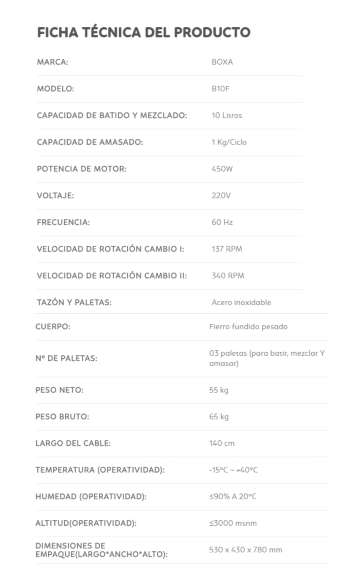 Batidora Multifuncional de 10 litros Amasadora y Mezcladora BOXA, diseñada y producida bajo estándares europeos y según el requerimiento nacional. Este equipo construido en fierro fundido y accionado por un motor y un juego de engranajes harán de sus productos un manjar satisfaciendo así sus expectativas deseadas. Por su gran demanda, hacen de este equipo muy confiable y seguro por los maestros operarios, siendo así usados en distintas líneas como la Panadera, Pastelería, Baguetería, Carnicería, Mezclados de polvos, líquidos, etc.