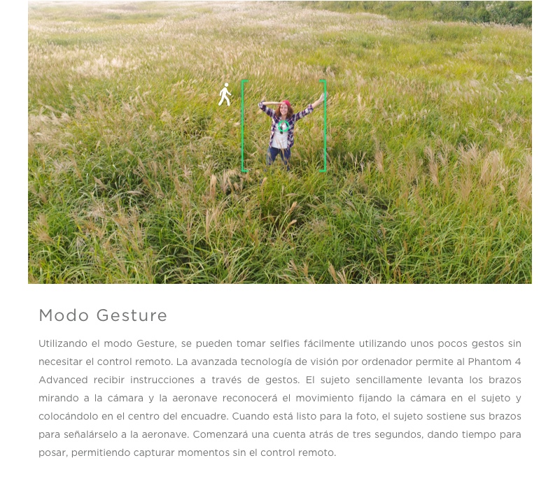 Con el Modo de gesto, las selfies se pueden capturar con unos pocos gestos sin el control remoto. La tecnología de visión artificial permite que el Phantom 4 Advanced tome instrucciones a través de gestos. El sujeto simplemente levanta sus brazos cuando mira hacia la cámara y la aeronave reconocerá este movimiento al bloquearlo y colocarlo en el centro del cuadro. Cuando está listo para una foto, el sujeto extiende sus brazos para señalar la aeronave. Comenzará una cuenta regresiva de tres segundos, lo que le dará tiempo para adoptar una postura, lo que permitirá capturar momentos sin el control remoto.