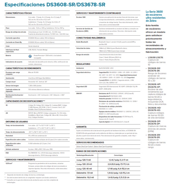 Cada día, los trabajadores en la planta de fabricación escanean miles de códigos de barras en los componentes de productos para garantizar la calidad del producto. Su productividad depende de la calidad del escáner que se le coloca en sus manos. Cuando sus trabajadores necesitan capturar los códigos de barras 1D y 2D pequeños y densos, comunes en la fabricación de equipos electrónicos y médicos, con los lectores de imagen de alta densidad DS3608-HD (con cable) / DS3678-HD (inalámbrico) usted le puede proveer lo mejor diseño resistente sin igual, escaneo sin igual y gestión inigualable. Escaneo avanzado ofrece captura sumamente rápida de cualquier código de barras 1D y 2D impresos directamente sobre los componentes de productos o etiquetas en prácticamente cualquier condición o mostrados en la pantalla. El diseño ultra resistente es prácticamente indestructible ideal para entornos desafiantes. Los escáneres no podrían ser más fácil y tomar menos tiempo de implementar y administrar. Cuando se trata de tecnología inalámbrica, el DS3678-HD está cargado con características exclusivas de Zebra, que lo coloca en una clase propia. DS3608-HD/ DS3678-HD el rendimiento imparable que necesita para maximizar la productividad de la fuerza laboral, mejorar la calidad del producto, reducir los tiempos de ciclo de producción y evitar el tiempo de inactividad imprevisto de la línea de producción.