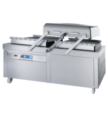 Bomba de vacío de gran potencia. Tecla de detención de vacío. Control electrónico. Paneles de inserción para regulación de altura. Cubierta de plexiglas – importante en el envasado de sopas y salsas. Procedencia alemana.