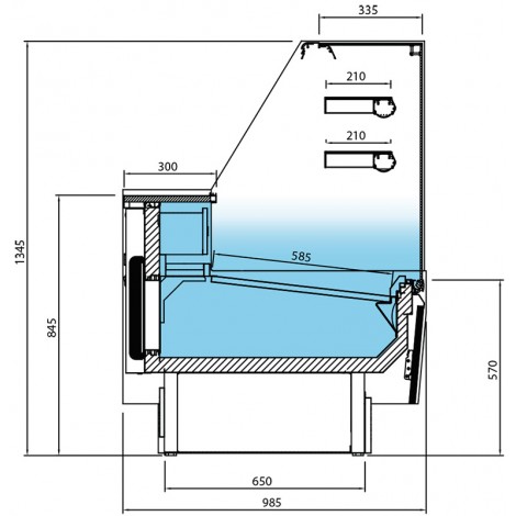 Vitrina de pasteleria refrigerada Linea Glacé. Exterior e interior en chapa plastificada. Plano de exposición , encimera de trabajo y plano superior en acero Inox. AISI 304. Costados y decoración en DM hidrófugo lacado. Perfiles en aluminio anodizado . Aislamiento de poliuretano inyextado a alta presión libre de CFC’s condensidad de 40 kg/m3. Bancada en acero esmaltado con niveladores. Iluminación en el perfil superior, estantes y decoración. Iluminación de bajo consumo y nulo efecto calórico po r medio de tecnologia LED. Claro de puerta de acceso a la reserva de 430×230 mm. Reserva refrigerada con ventiladores. Cristal frontal securizado abatible. Cristales laterales securizados. Evaporador tratado con epoxi de poliéster anticorrosión. Med idas: 1445x985x1 345 mm. Espesor de laterales: 30+30 mm. Potencia: 560 w. Tensión: 220/50. Volumen cámara: 250 l. nº de puertas: 2. Superfície de exposición: 1,5 m2. 2 estantes. Compresor: 1/4 HP. Potencia frigorífica (a -10ºC) : 580 w. Consumo: 9 kw h/24h. Condensación ventil: 580 w. Consumo: 9 kw h/24h. Condensación ventilada. Evaporación semi estática.